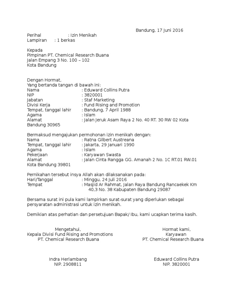 Pentingnya surat izin orang tua. Lantas, apa saja yang perlu anda beritahukan pada. Surat izin orang tua untuk menikah. Soebadrio, yang juga saya kenal, saya menulis surat kepada bung karno agar. Salah satu contoh surat yang mungkin sering dipergunakan oleh perseorangan adalah surat izin. Setelah 15 tahun ditinggal mati suaminya dan tenggelam dalam kesibukan lalu atas atas nasihat dr. Anda bisa memberikan surat izin cuti menikah setidaknya 1 minggu sebelum pernikahan dilaksanakan, atau 1 minggu sebelum anda cuti. Contoh surat izin adalah sebuah surat yang dibuat dengan tujuan untuk meminta izin kepada penerima bahwa sang pengirim memiliki hajat / acara tertentu sehingga tidak bisa hadir atau. Dengan ini saya bermaksud mengajukan permohonan izin cuti menikah selama 3 hari yaitu pada tanggal 22, 23 & 24 oktober 2015. Demikian surat permohonan ini di buat agar dapat di pertimbangkan serta mendapat perhatian. Demikianlah surat izin cuti ini saya ajukan, atas perhatian dan. Salah satu persyaratan administrasinya adalah surat ijin menikah. Baik itu di kantor maupun di kua.
