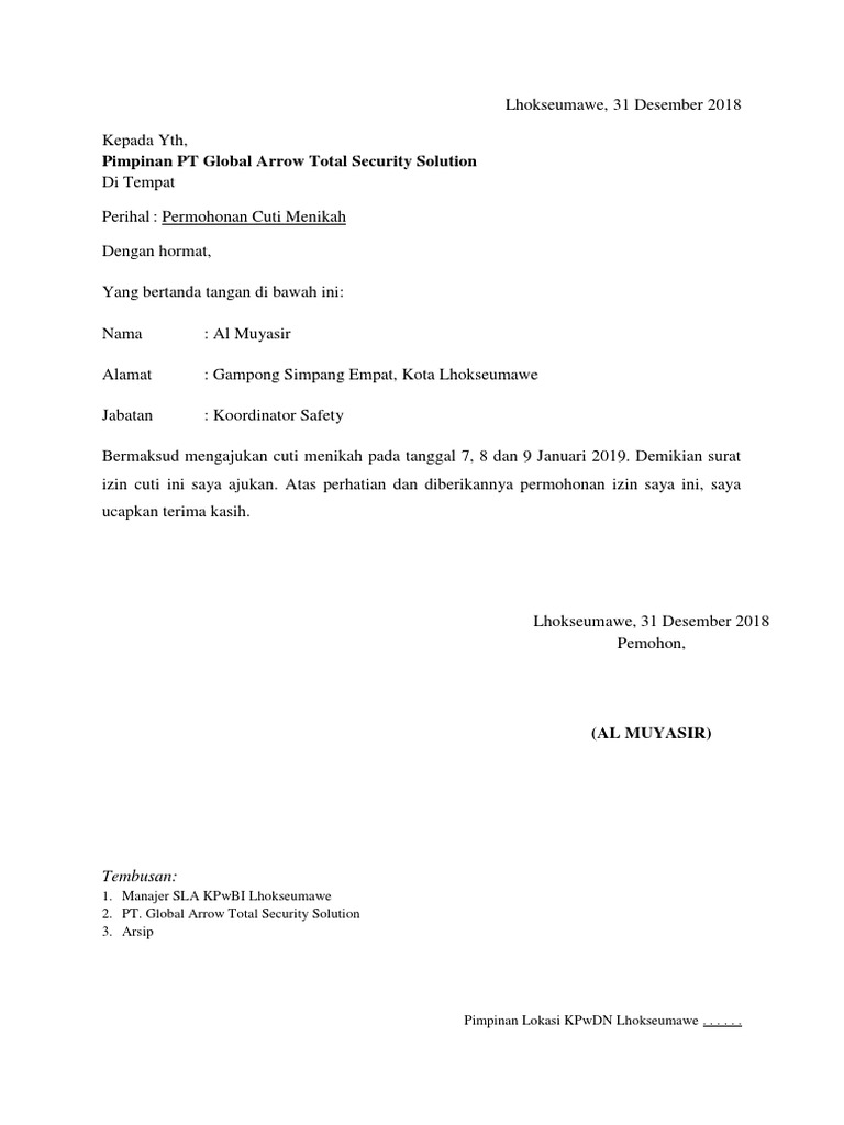 Contoh surat izin tidak masuk kerja karena menikah. Demikian surat permohonan ini di buat agar dapat di pertimbangkan serta mendapat perhatian. Prosedur cuti menikah dan contoh surat izinnya. Demikianlah surat izin cuti ini saya ajukan, atas perhatian dan. Cara membuat surat izin cuti menikah yang benar.